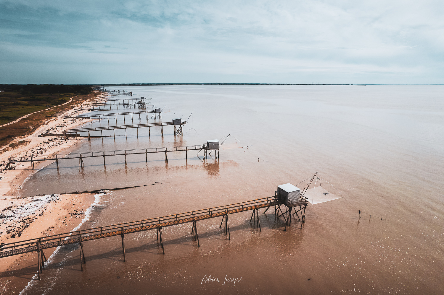 Au sud de la commune s’étendent 4 km de plage de sable fin découpés par des épis de bois ou des roches et parsemés de nombreuses pêcheries sur pilotis si caractéristiques de la Côte de Jade. Ici elles s’enchaînent par dizaines à perte de vue. Elles sont à la fois très semblables et si uniques chaque propriétaire y ayant mis un peu de lui-même. Mais aux Moutiers la star des pêcheries, celle qui fait se déplacer les photographes c’est bien sûr la pêcherie double. Cette dernière a la particularité d’avoir un ponton d’accès en Y desservant 2 cabanes de pêche.